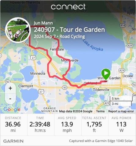 The Tour de Garden, held on Saturday, September 7, 2024, ushered in a beautiful day of cycling camaraderie and community spirit in Winter Garden, Florida. As with most mass rides in the Sunshine State, the day began early, with enthusiastic participants arriving between 6:30 and 7:00 AM. With broken clouds dotting the sky and a temperature of 76°F that felt a bit warmer due to the humidity hovering at 98%, it was a perfect day for cycling.